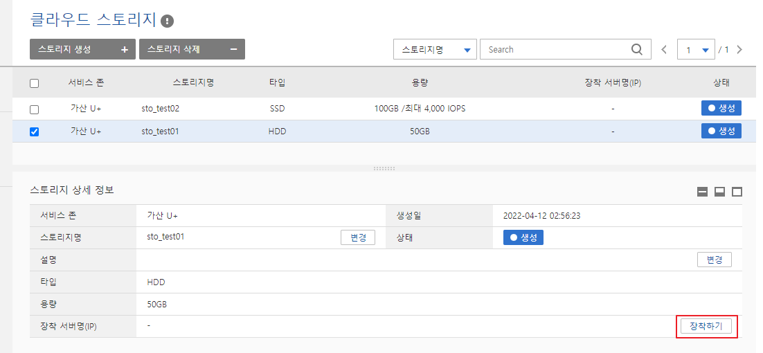 2. 스토리지 목록에서 서버에 연결(장착)할 클라우드 스토리지를 선택하고 스토리지 상세 정보에서 [장착하기] 버튼을 클릭합니다.
