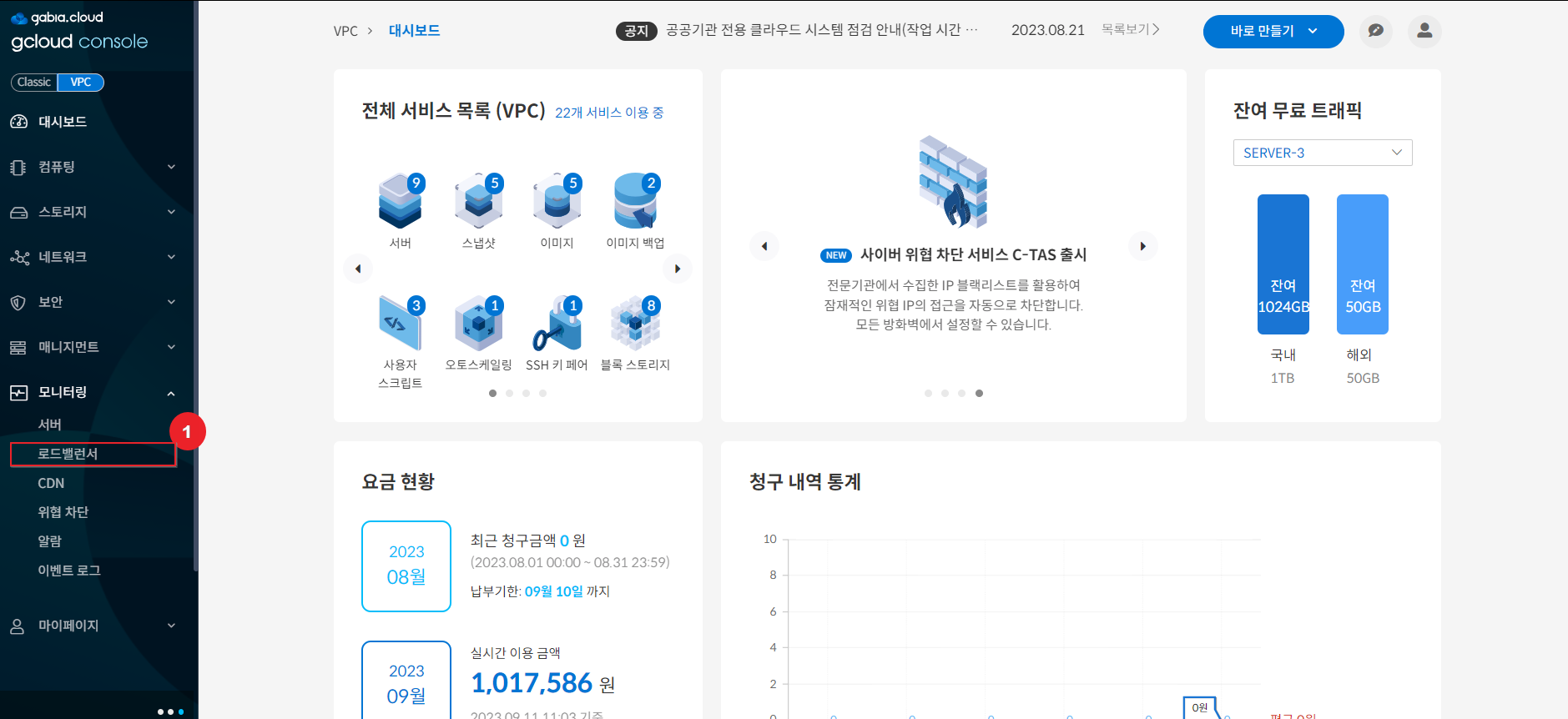 g클라우드 관리콘솔(gcloud.gabia.com)에서 로드밸런서 모니터링을 확인할 수 있습니다.