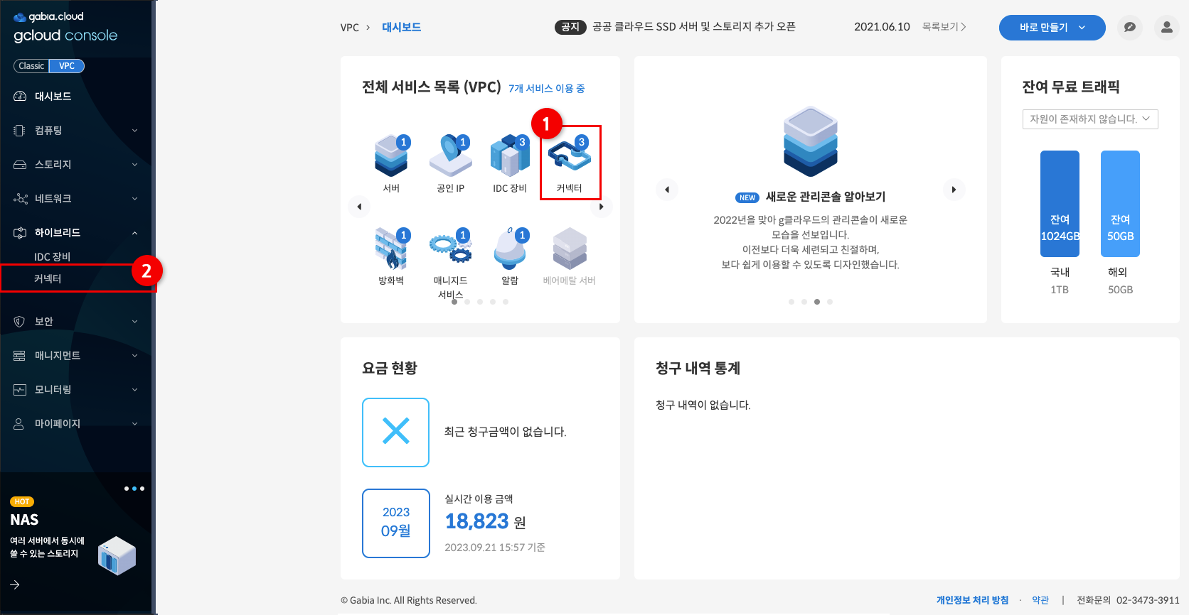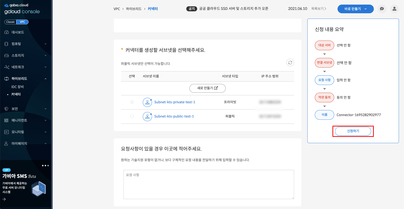 g클라우드 관리 콘솔(gcloud.gabia.com)의 [커넥터]에서 서비스를 신청할 수 있습니다.