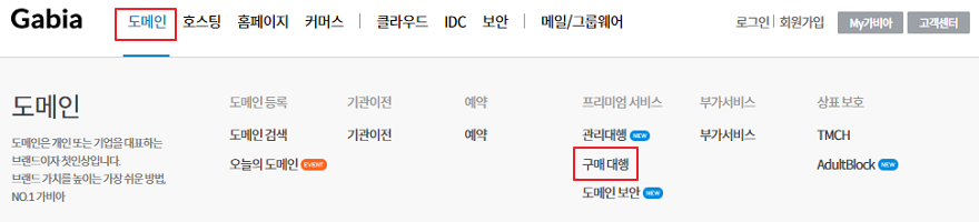 2. 로그인 후 가비아 홈페이지 상단 [도메인]에 마우스를 올린 후 [구매대행]을 클릭합니다.