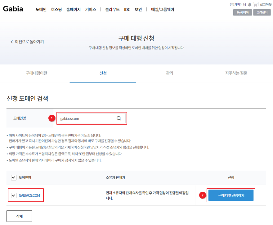 3. 구입을 희망하는 도메인 명을 검색 후 [구매대행 신청하기]를 클릭합니다.