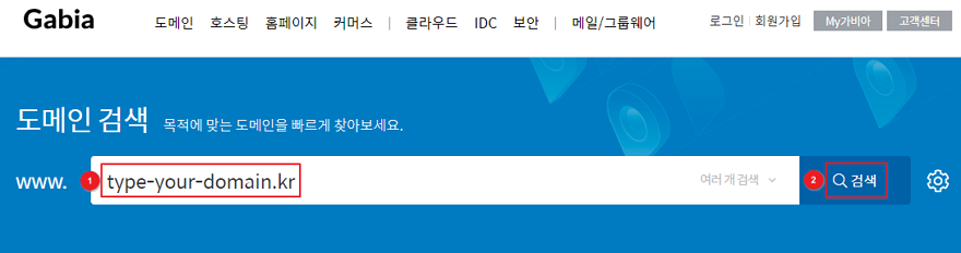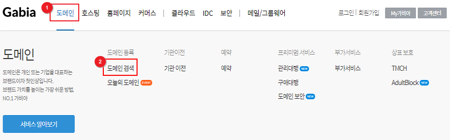2. 로그인 후 가비아 홈페이지 상단 [도메인]에 마우스를 올린 후 [도메인 검색]을 클릭합니다.