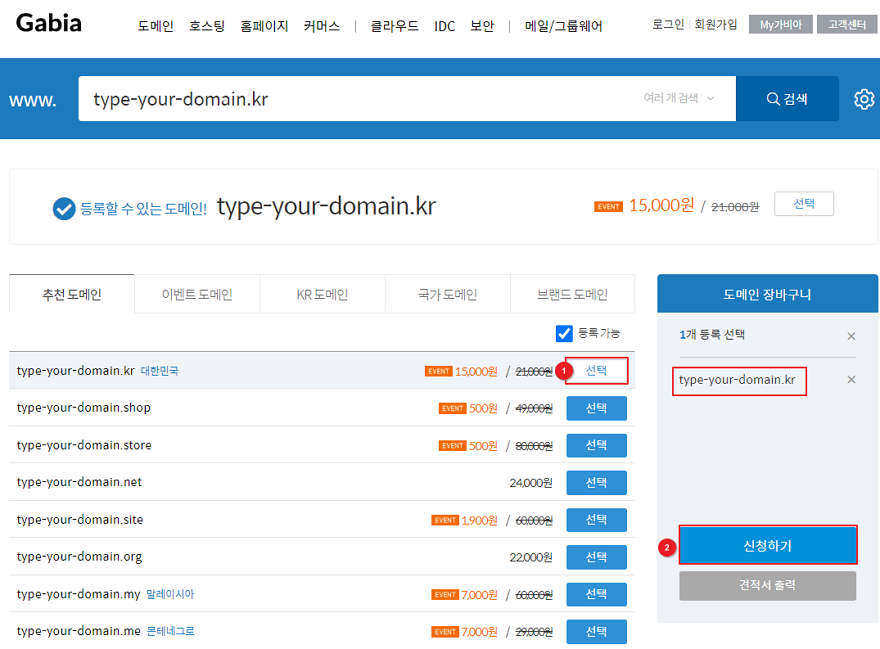 4. 도메인 상태를 확인합니다. 등록 가능한 상태인 경우, [선택]을 클릭해 도메인 장바구니에 담습니다.