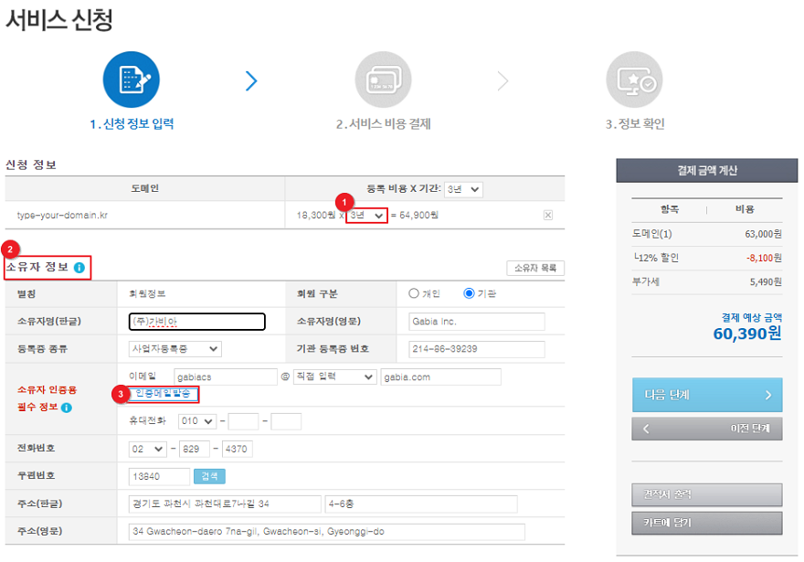 5. 도메인 등록 기간을 선택한 후 소유자 정보를 입력합니다.