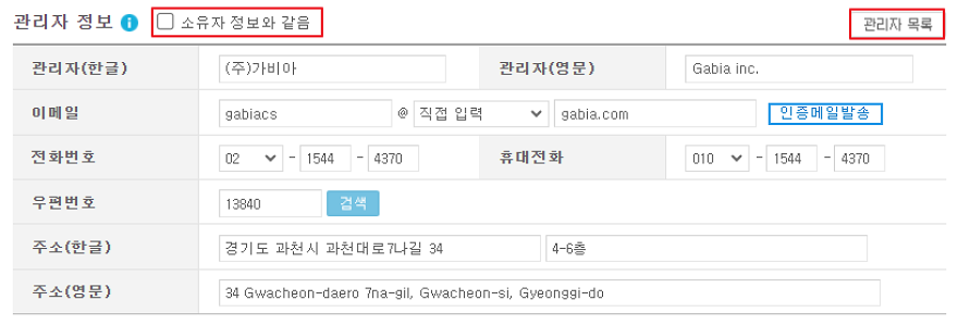 • [소유자 정보와 같음]에 체크하거나 [관리자 목록]을 클릭하면 편리하게 입력할 수 있습니다. |