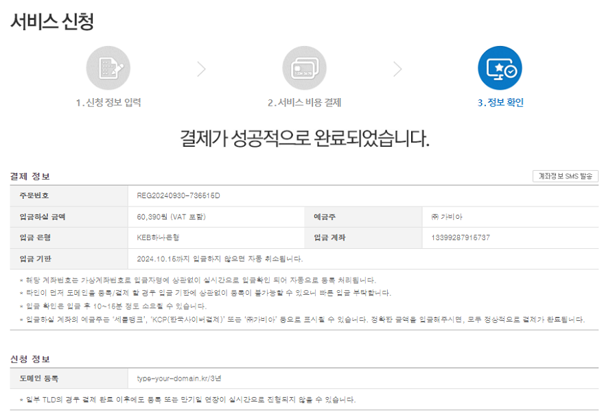| • 도메인 등록은 결제 후 10~15분 정도 소요될 수 있습니다. • 일부 TLD의 경우, 결제 완료 후 필요 서류를 제출해야 합니다. • 타인이 먼저 도메인을 등록한 경우, 등록이 불가능할 수 있습니다.a |