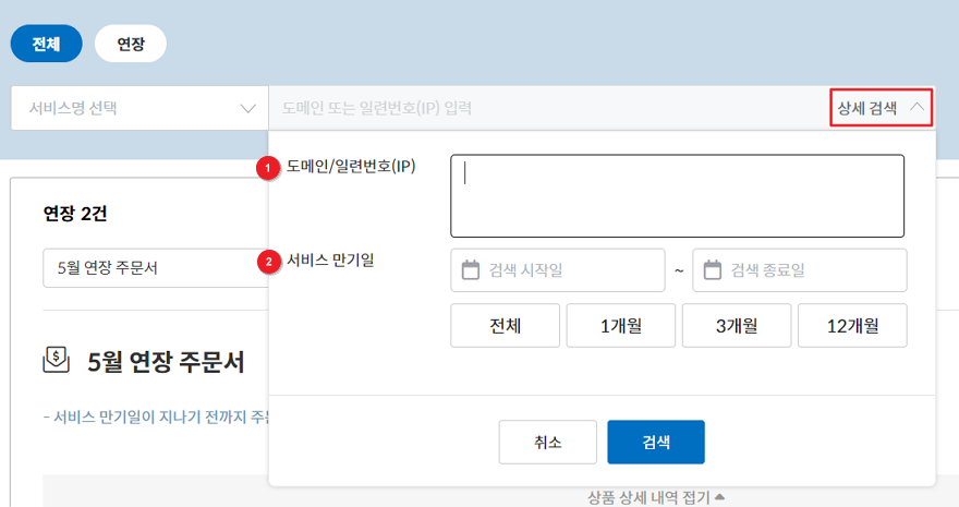 만기일이 도래하지 않은 서비스를 미리 연장하고자 한다면 [상세 검색]을 클릭해 연장할 서비스를 검색할 수 있습니다.