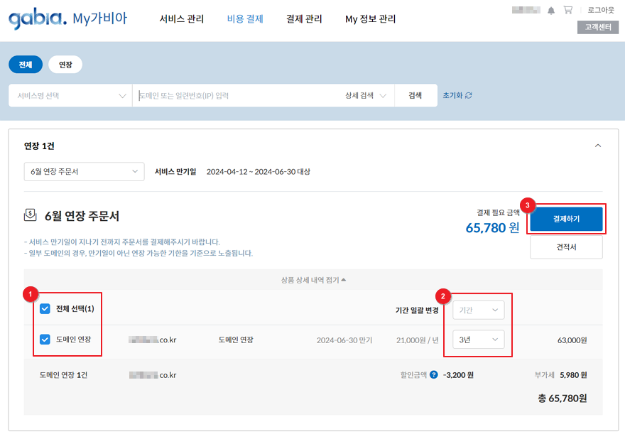 4. 비용 결제 페이지에서는 일정 기간 동안의 연장 대상 서비스가 모두 노출됩니다.