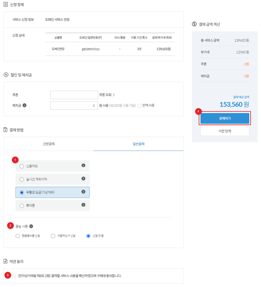 • 가상 계좌를 발급받는 경우, 해당 계좌의 입금 기한이 아닌 도메인 만기일 전까지 결제가 이루어져야 합니다. • 만기일이 지나면 도메인 사용이 중지되어 사이트 운영, 메일 이용, 정보 변경 등이 불가합니다. |