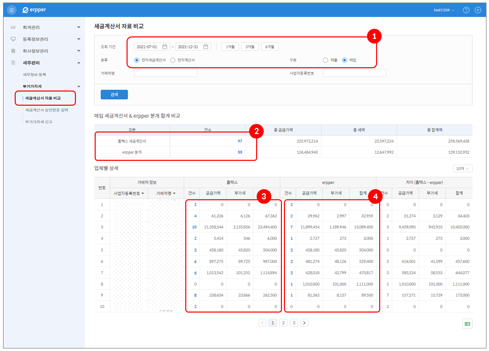 ① 조회 기간: 설정된 날짜를 기준으로 국세청 홈택스에 신고된 세금계산서 또는 계산서와 erp 회계 전표 차이를 조회 할 수 있습니다.