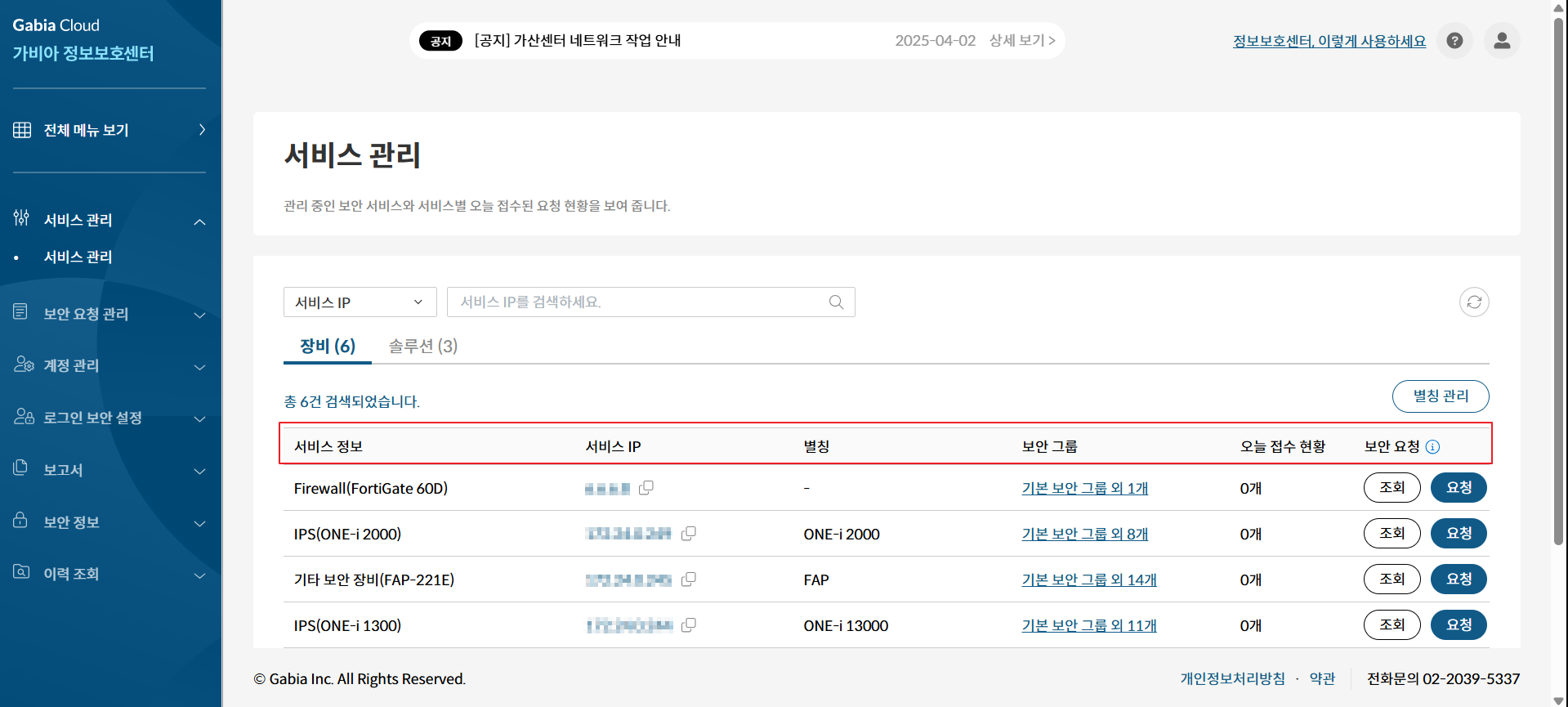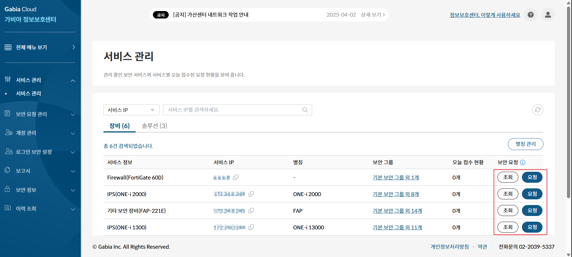 관리 중인 장비 또는 솔루션에 Member 이상 권한을 가진 경우, 서비스 관리 목록에서 곧바로 보안 요청을 등록할 수 있습니다.
