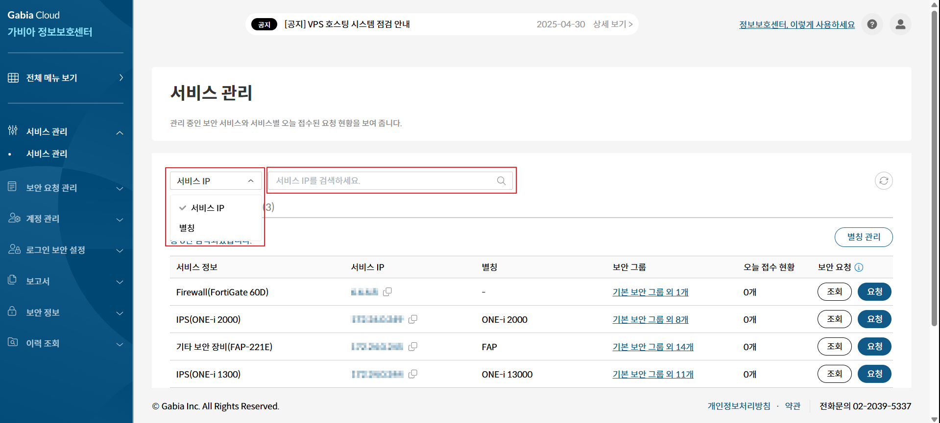 관리 중인 보안 서비스를 조하고 서비스별로 오늘 접수된 요청 현황을 확인하는 메뉴입니다.
