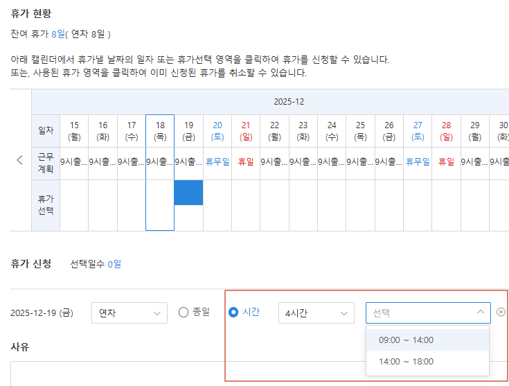 휴가 시작 시간 제한 : 시작시간 제한 설정을 하는 경우 사용자는 휴가 신청 시 아래와 같이 근무계획 기준으로 시청가능한 시간차 휴가 구간이 출력되어 선택가능합니다.