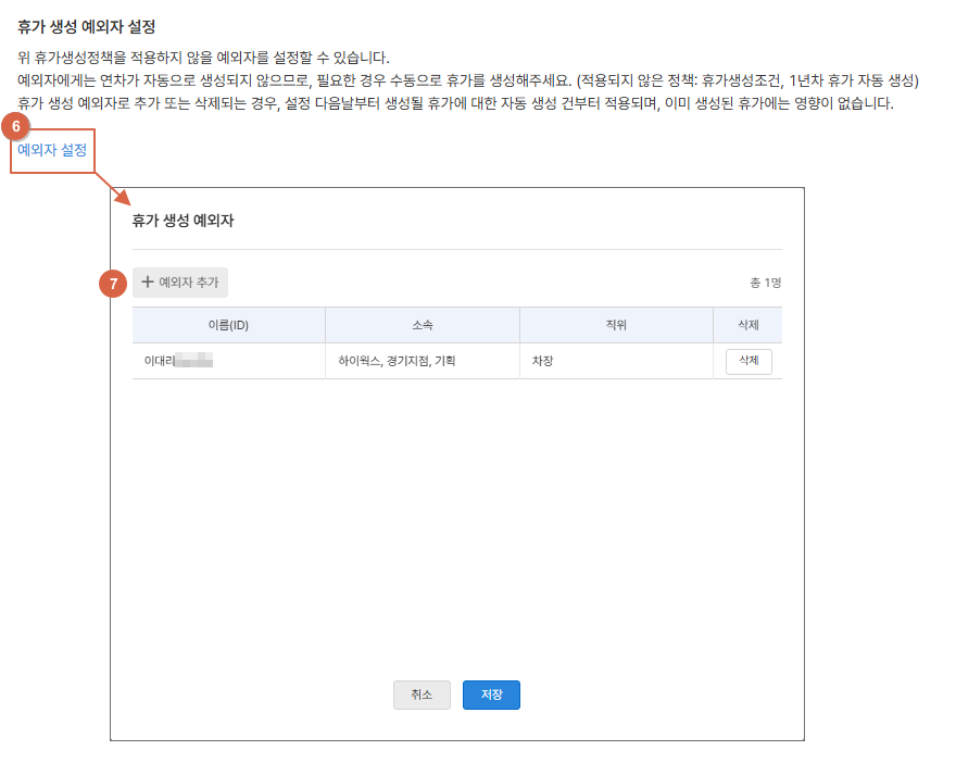 ⑥ [예외자 설정] 클릭하면 휴가 생성 예외자 화면을 확인할 수 있습니다.