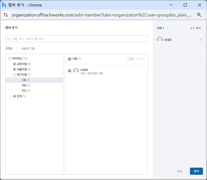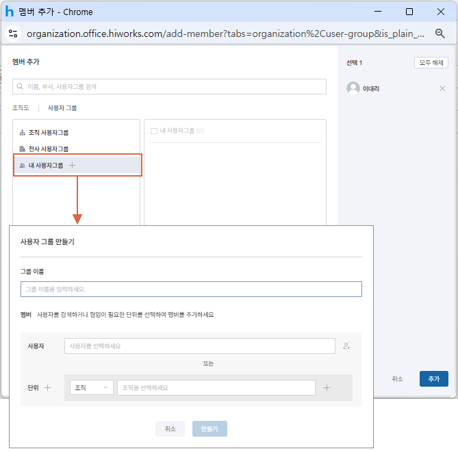 • 사용자 그룹 메뉴는 22년 8월 30일 이후 하이웍스를 신청한 신규 상품 오피스만 반영되며, 기존 고객은 추후 신규 상품으로 전환 후 이용하실 수 있습니다.