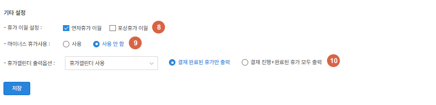⑨ 마이너스 휴가사용 여부를 설정할 수 있습니다.