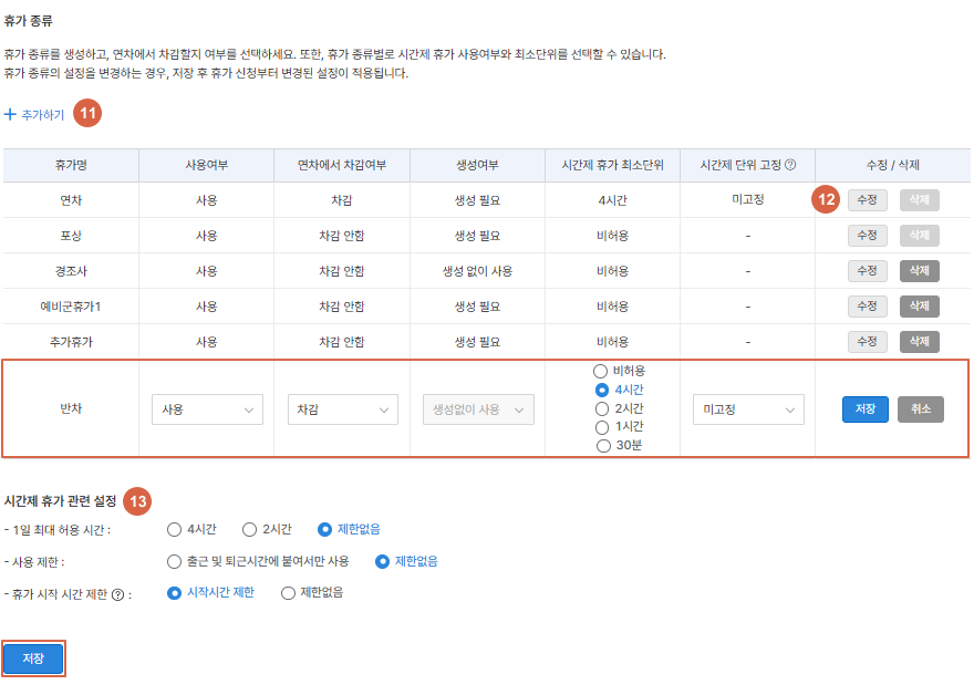 ⑫ 등록된 휴가종류의 사용여부와 시간제 휴가 최소단위 등을 수정할 수 있습니다.