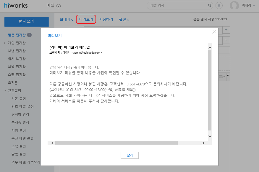메일을 보내기 전 [미리보기]를 클릭하여 메일 내용을 사전에 확인 할 수 있습니다.