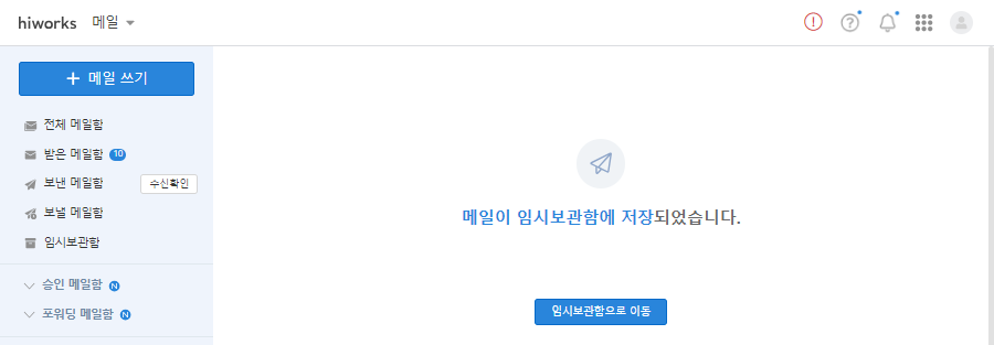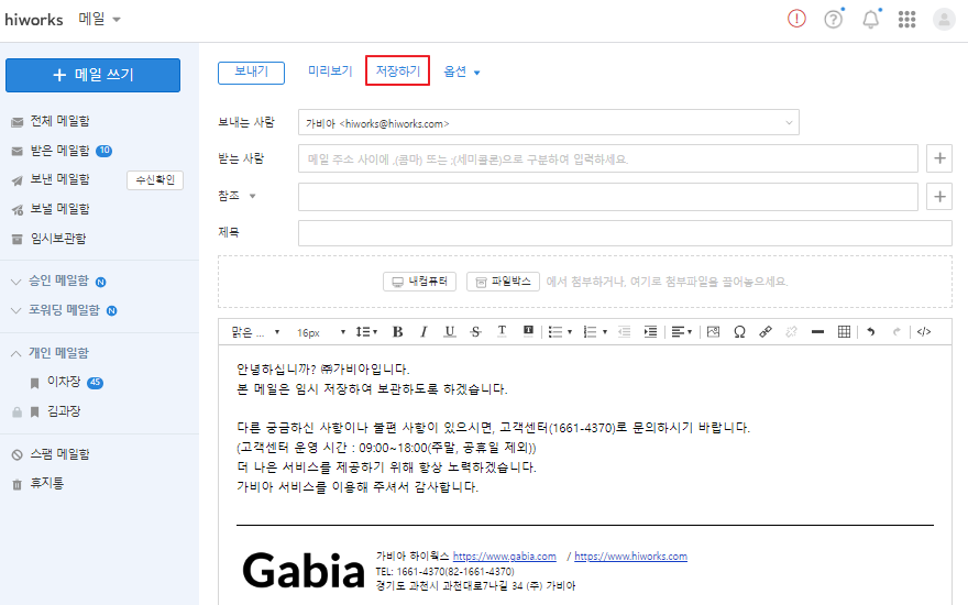 4. 메일을 작성한 후 [저장하기]를 클릭하면 해당 메일은 즉시 임시보관함에 저장됩니다.