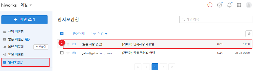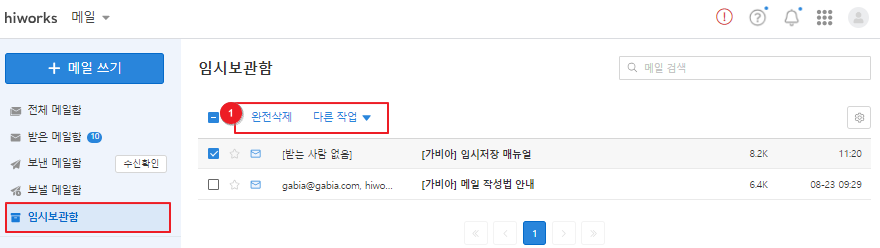 ① 임시 보관함에 저장된 메일의 체크 박스를 클릭하면 완전삭제, 다른 작업(읽음으로 표시, 안 읽음으로 표시, 별 표시, 별 제거, 다운로드(PC저장))을 진행할 수 있습니다.