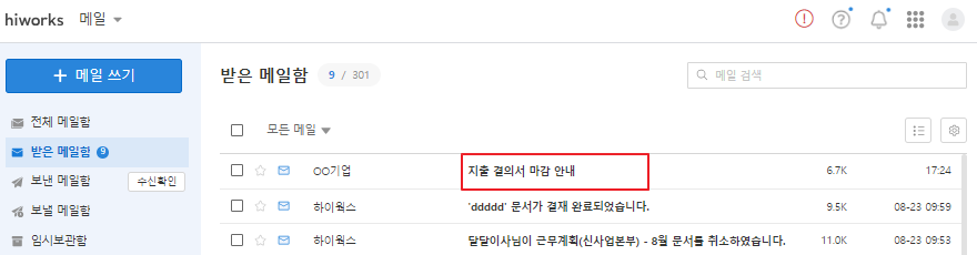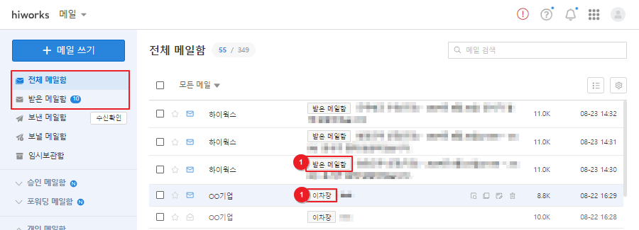 ① [전체 메일함]을 클릭할 경우 메일 제목 좌측에 해당 메일이 분류된 메일함 이름이 표시됩니다.