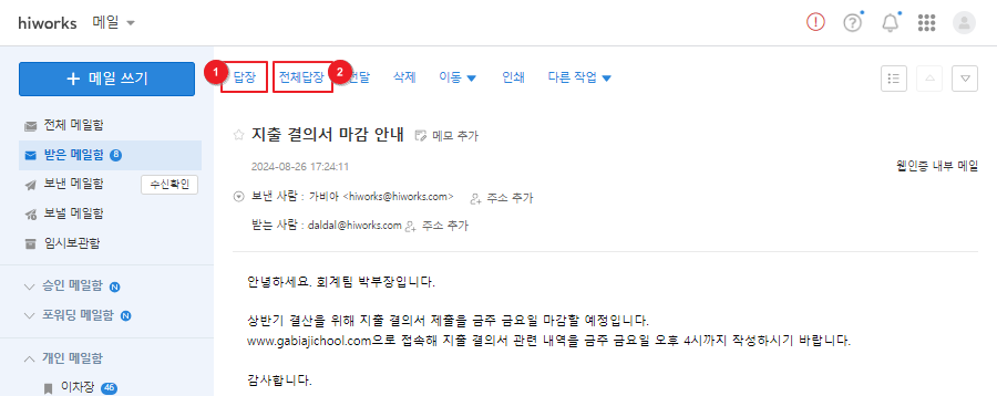 ② 메일에서 [전체답장]을 클릭하면 보낸 사람 포함 참조자에게도 메일을 회신합니다.