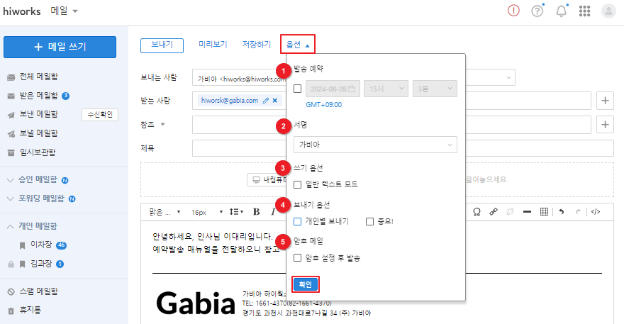 ③ 쓰기 옵션: 일반 텍스트 모드로 전환할 수 있습니다. 일반 텍스트 모드를 적용하면 작성된 내용은 메일 유지되지만 수신확인 옵션, 글꼴 스타일, 이미지 등의 첨부내용이 전부 사라집니다.