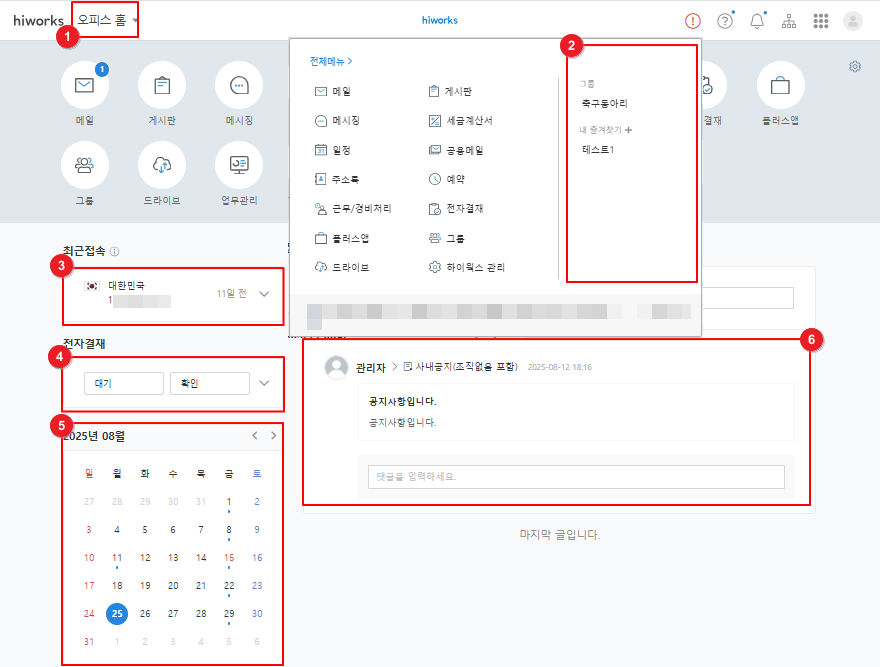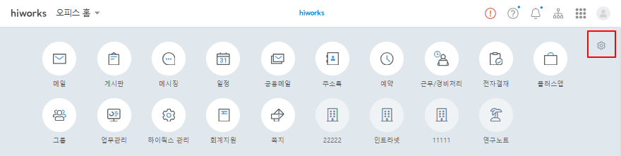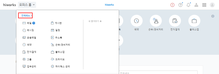 ① [오피스홈]을 클릭하면 하이웍스의 메뉴가 표시됩니다.