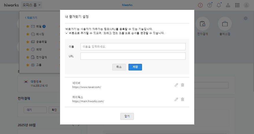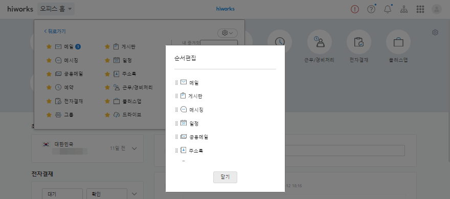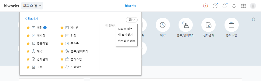 5) [인트라넷 메뉴] 설정은 오피스 전체관리자에게만 표시됩니다. [하이웍스 관리 > 오피스 관리 > 오피스 메뉴 설정 > 인트라넷 메뉴 설정]에서 전체관리자가 지정한 메뉴가 전체 오피스 사용자에게 표시됩니다.