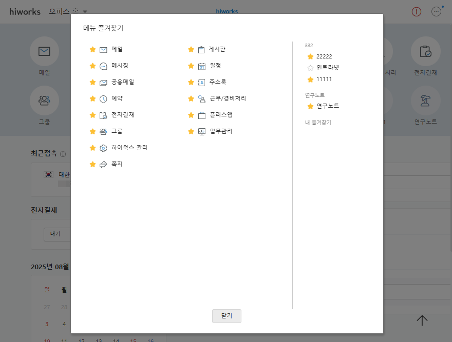 2) 메뉴 즐겨찾기 설정에서 즐겨찾기(★) 설정/해제 시, 설정한 메뉴만 상단 바에 표시됩니다.