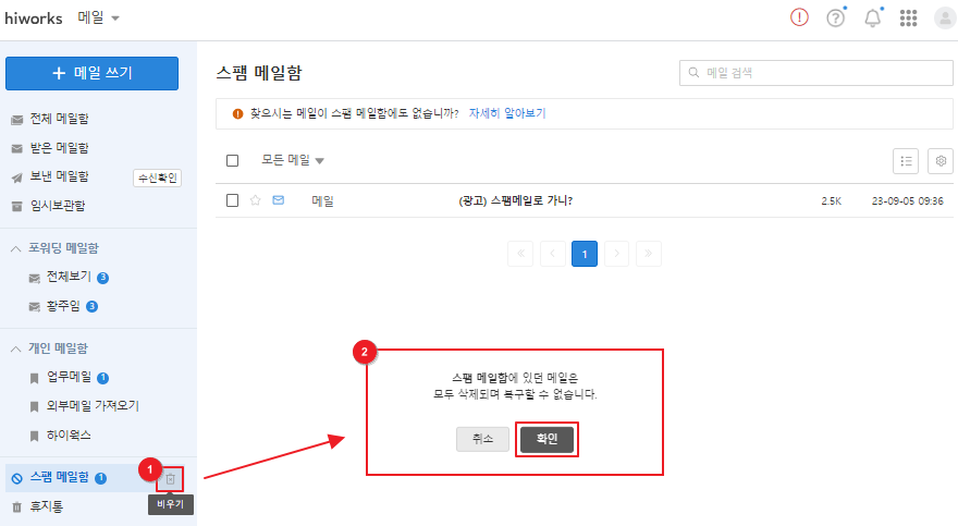 ② [확인] 클릭 시 선택한 메일함의 메일은 모두 삭제되며 복구할 수 없습니다.