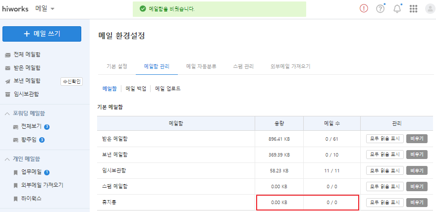 4. 메일함 비우기는 즉시 반영되어 해당 메일함에 저장된 메일 용량과 메일 수가 0으로 변경됩니다.