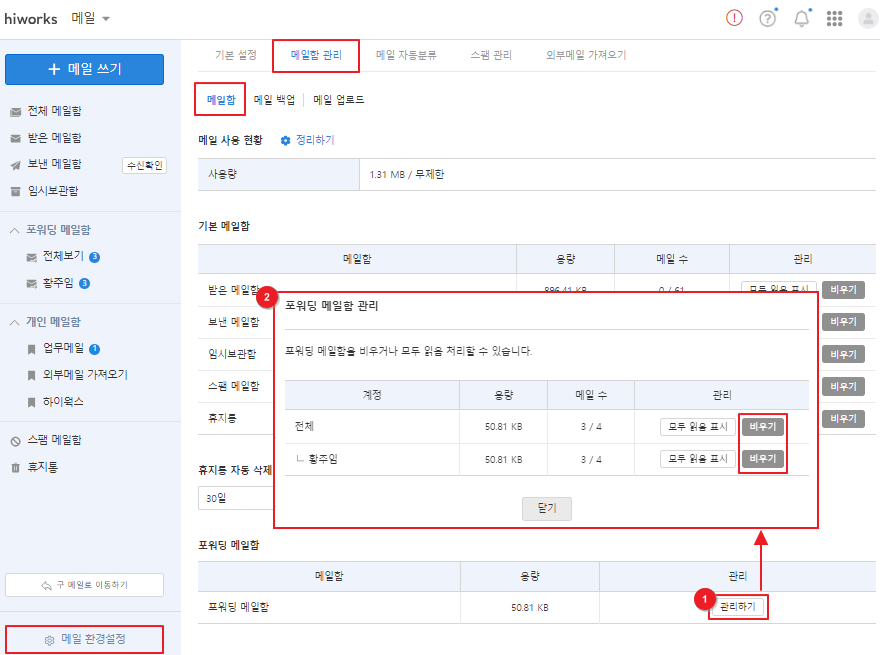 3. [메일 환경설정 > 메일함 관리 > 메일함]으로 이동해 비울 메일함 우측의 [비우기]를 클릭합니다.