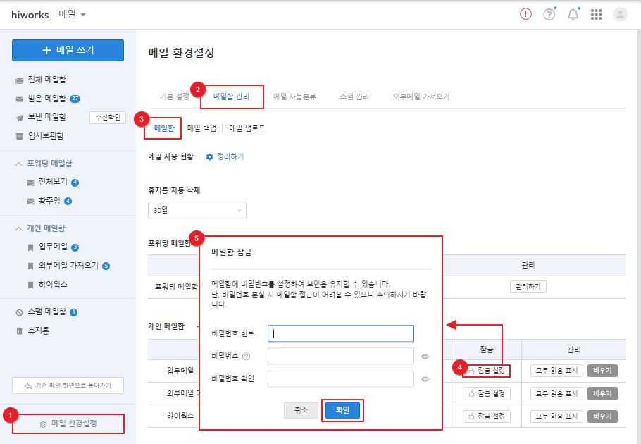 ⑤ 메일함 잠금 설정 후 [확인]을 클릭합니다.