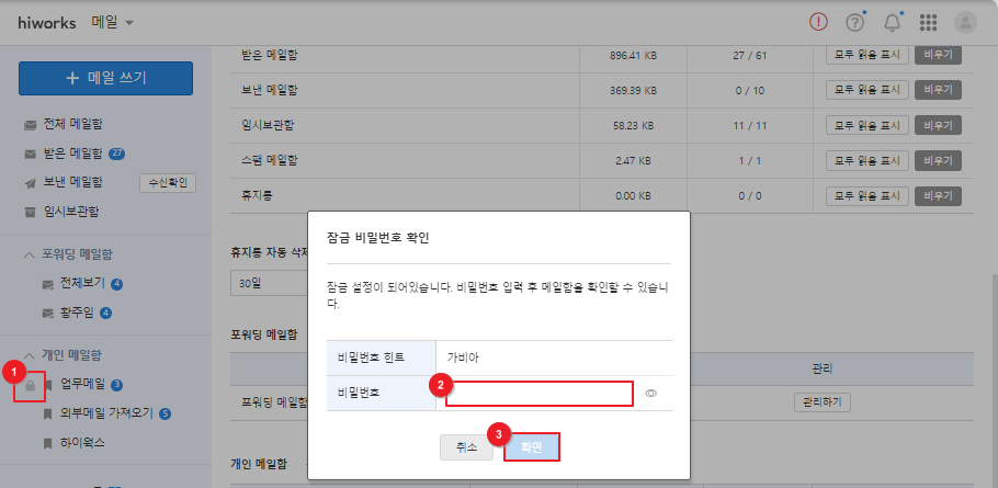 ⑤ 잠금 메일함의 비밀번호를 입력 후 [확인]을 클릭하면 메일함 잠금 기능이 즉시 해제됩니다.