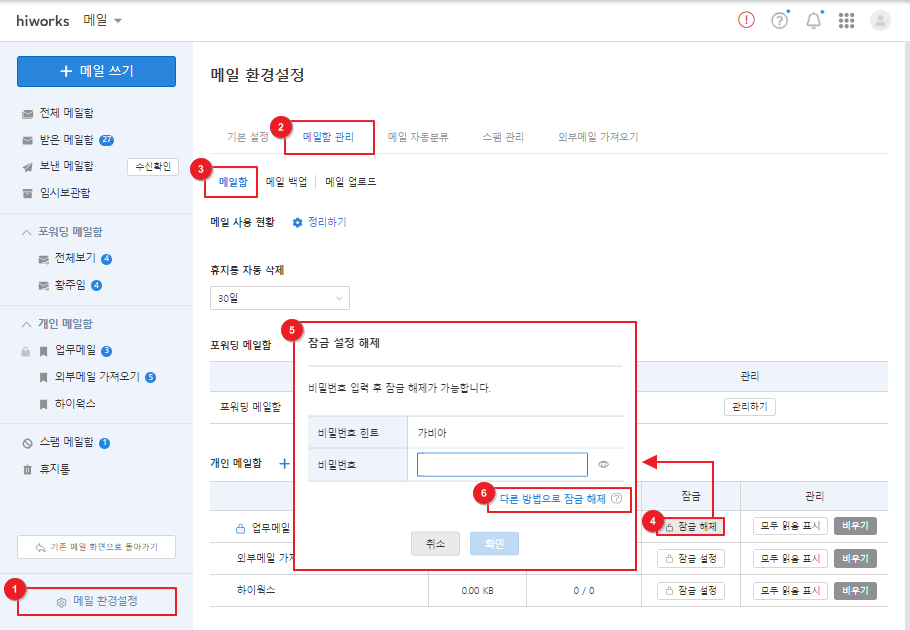 1. 잠금 메일함은 [메일 환경설정 > 메일함 관리 > 메일함 > 잠금 해제]를 클릭해 잠금 설정을 해제할 수 있습니다.