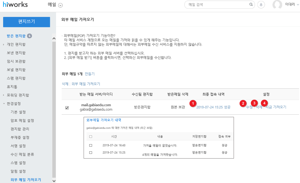 ④ [지금 가져오기]를 클릭하면 연동 간격과 상관없이 해당 시간을 기준으로 메일을 가져올 수 있습니다.