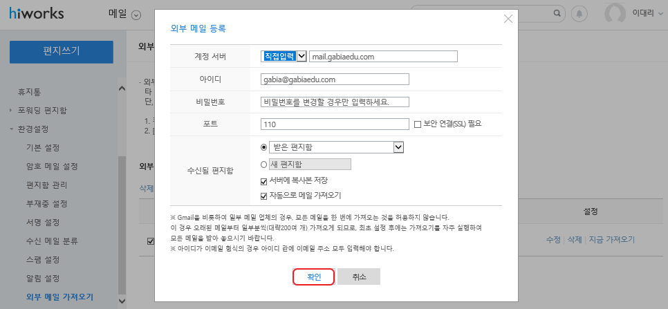 4. 등록된 외부 메일의 정보 수정을 완료한 후 [확인]을 클릭합니다.