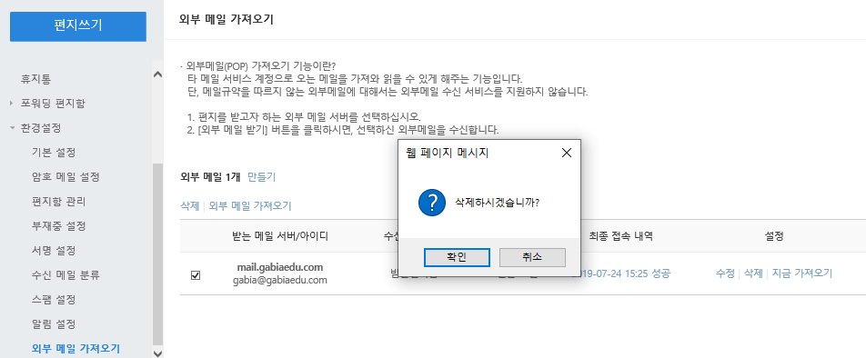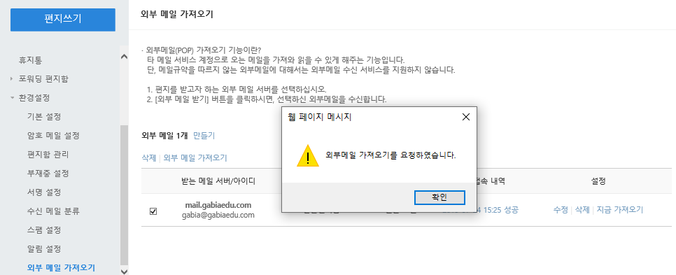 3. [환경설정 > 외부 메일 가져오기]를 클릭합니다.