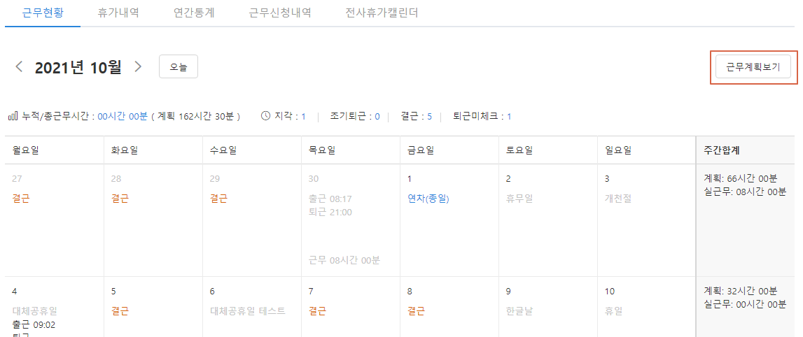 ① [내 근무>근무 현황] 페이지 오른쪽 위에 위치한 [근무계획 보기] 버튼을 클릭합니다.