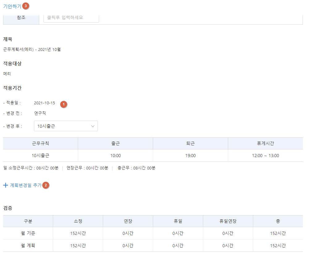 ③ 변경할 근무계획이 적용되었을때의 월계획 시간과 월 법정근무시간을 확인 후, 상단 결재선을 설정한 후 [기안하기]를 클릭하면 근무계획 변경이 신청됩니다.