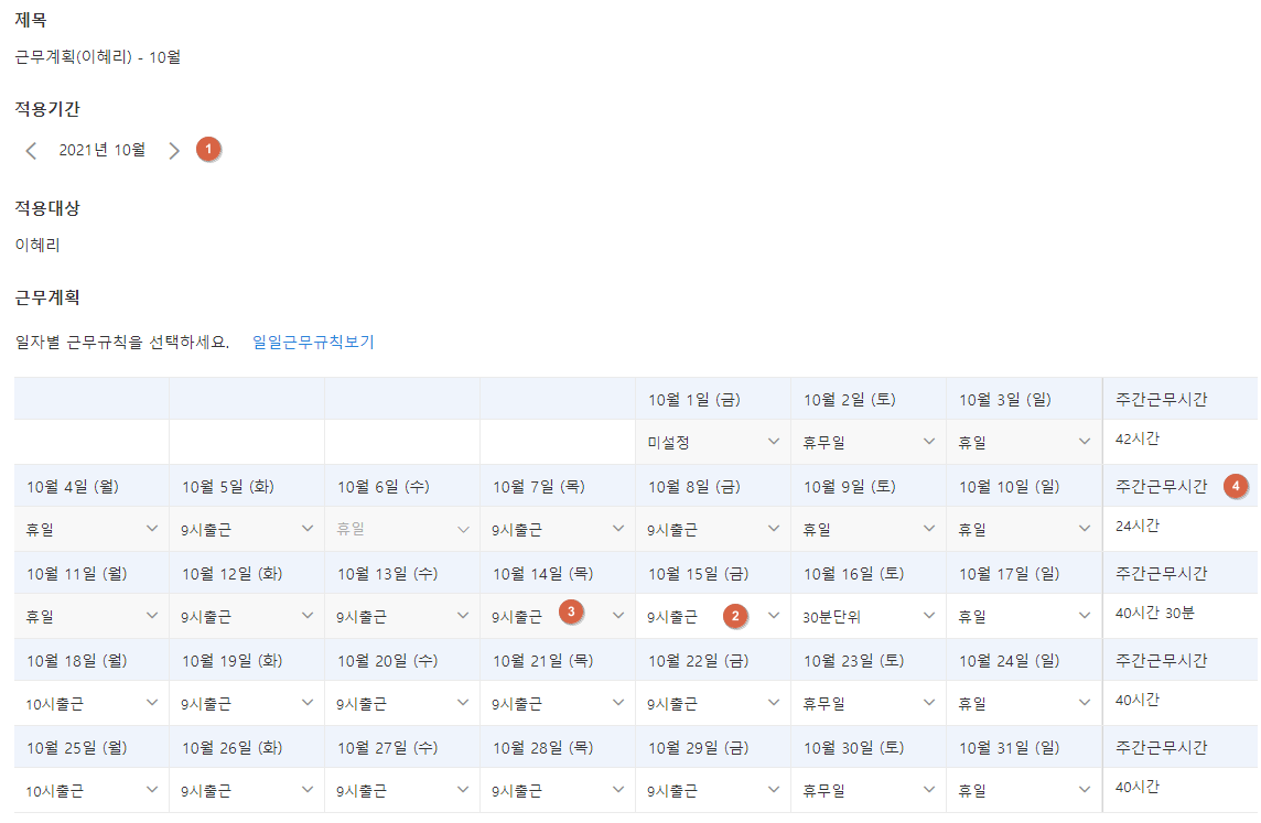 - 일자별로 적용할 근무규칙을 선택하여 근무계획을 설정합니다. 선택한 규칙에 의한 주간 합계근무시간을 주간근무시간 영역에서 바로 확인할 수 있습니다.