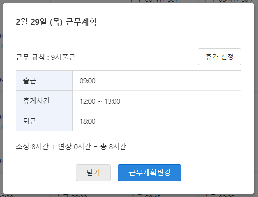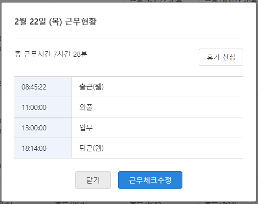 오늘 이전 날짜에는 실제 근무정보가 나타납니다. (출근/퇴근시간, 실제근무시간) 클릭하면 근무현황 레이어가 출력됩니다.