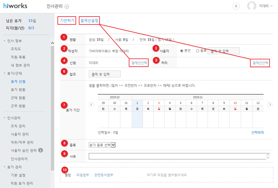 ⑧ 신청하는 휴가 종류를 선택할 수 있습니다. 휴가 종류는 전체 관리자(슈퍼 관리자) 또는 인사 관리자가 [인사관리 > 휴가 관리 > 기본 설정 > 휴가 종류]에서 추가, 사용 여부, 연차에서 차감 여부 등을 설정할 수 있습니다.