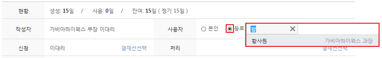 인사관리자 또는 조직장의 경우, ③의 사용자 항목에서 동료를 선택하면 ①의 휴가 일수는 해당 동료의 올해 휴가 현황으로 변경되어 표시됩니다.