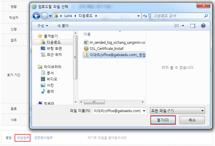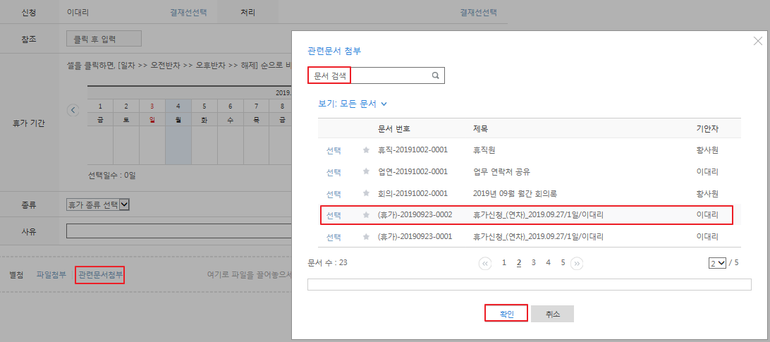 ⑩ 필요한 증빙 서류 등을 파일로 첨부하거나, 기안된 문서 중 관련 문서가 있을 경우 검색하여 별첨 할 수 있습니다.