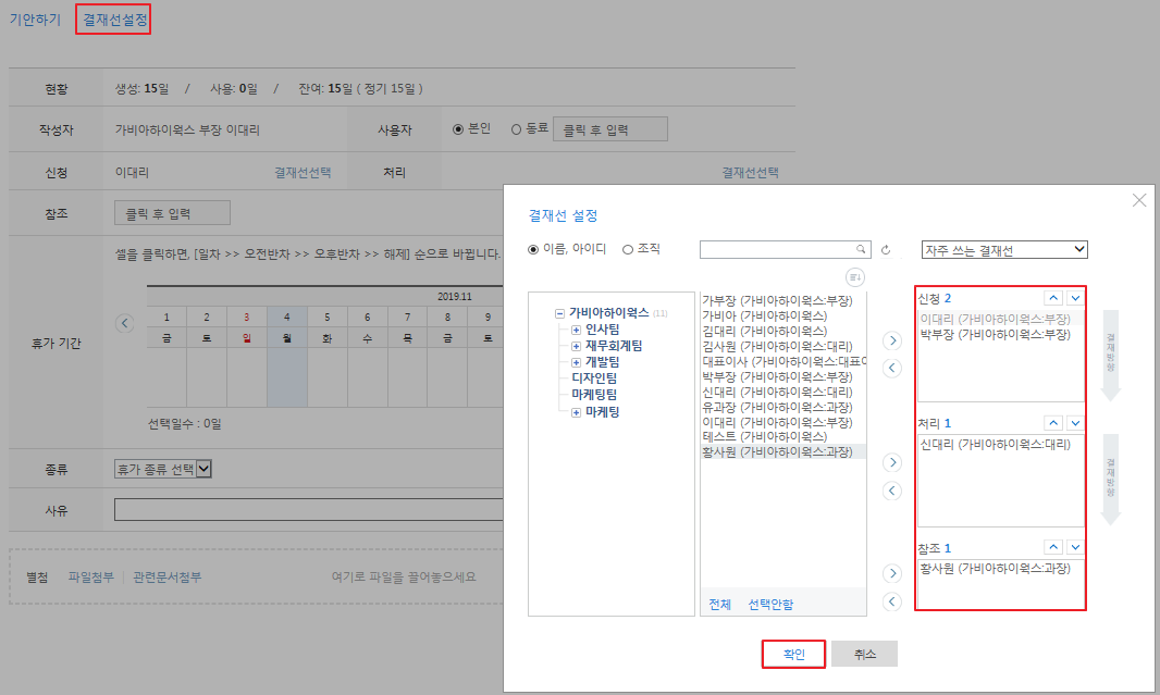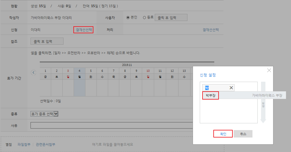 ④ '신청'란에는 내가 속한 부서의 직속 결재권자를 클릭 후 입력 또는 상단 '결재선설정'을 클릭해 조직도에서 선택할 수 있습니다.