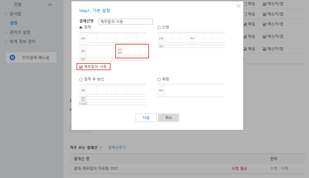 결재 포맷의 경우, [재무합의 사용] 좌측 체크박스에 체크 시 합의란 우측에 재무 합의란이 생성됩니다.