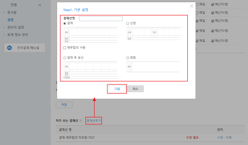 (1) [결재선추가]를 클릭 후 결재선명 입력 및 결재 포맷 선택 후 [다음]을 클릭합니다.