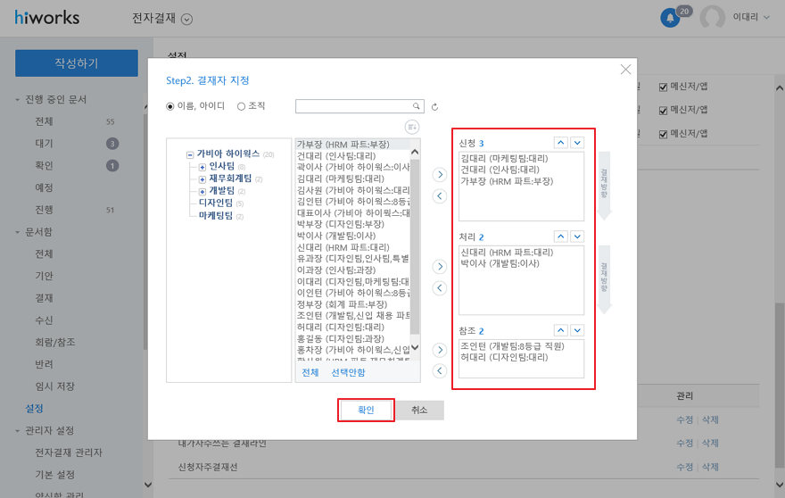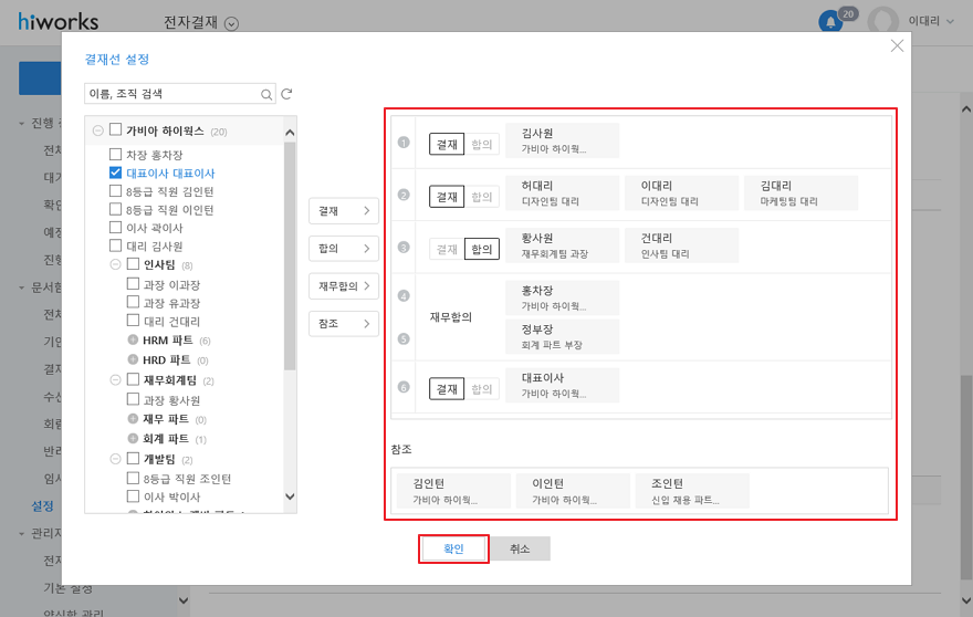 좌측의 조직 목록에서 이름 또는 조직을 체크해 [결재/합의/재무 합의/참조]를 선택하거나, 우측에 생성된 결재선으로 드래그 앤 드롭하여 결재선 지정 완료 후 [확인]을 클릭합니다.